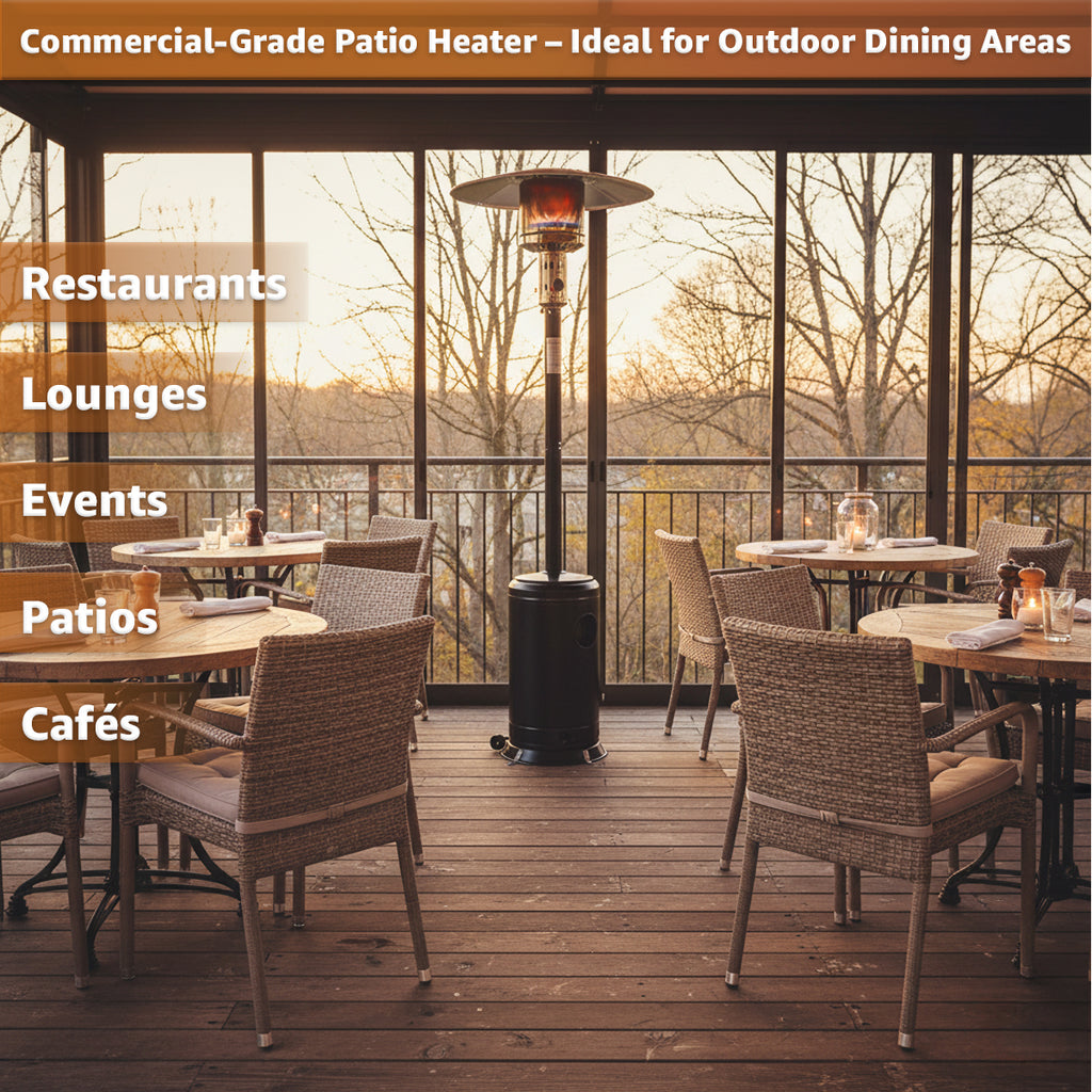 Extend Outdoor Seating Season: By keeping guests warm on cooler nights, this heater helps businesses maximize patio and deck seating and fall, while also enhancing comfort in residential backyards