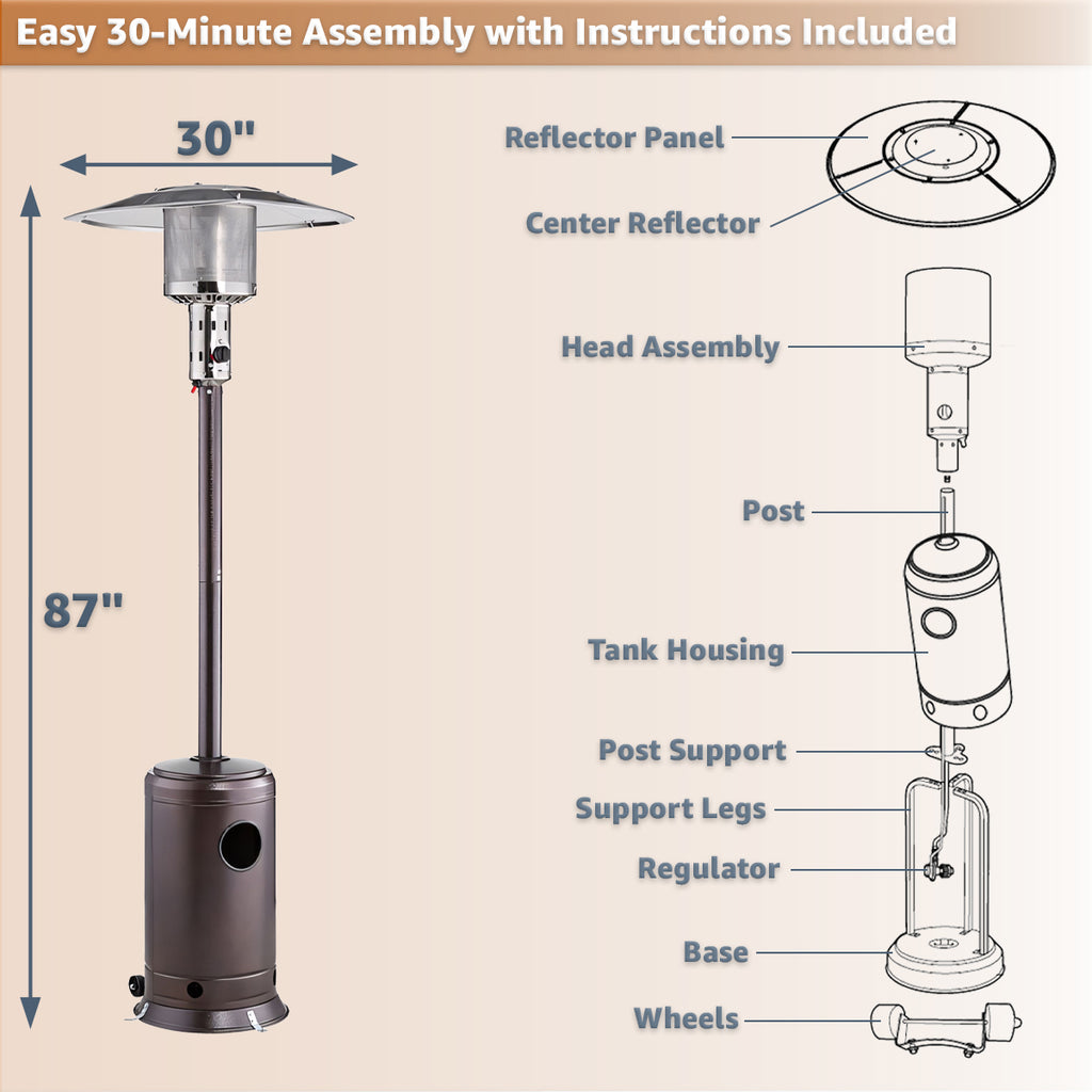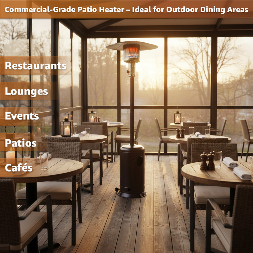 Safe & Convenient Operation: Designed with simple ignition and adjustable heat controls, this bronze patio heater ensures dependable performance for commercial spaces, restaurants, poolside bars, catered events, and residential patios